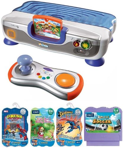- Includes V-Motion System as pictured and 4 additional games: V Smile Game Spiderman & Friends - Doc Ock's Challenge, V Smile Game Little Red Riding Hood, V Smile Game Superman, V Smile Game Soccer Challenge